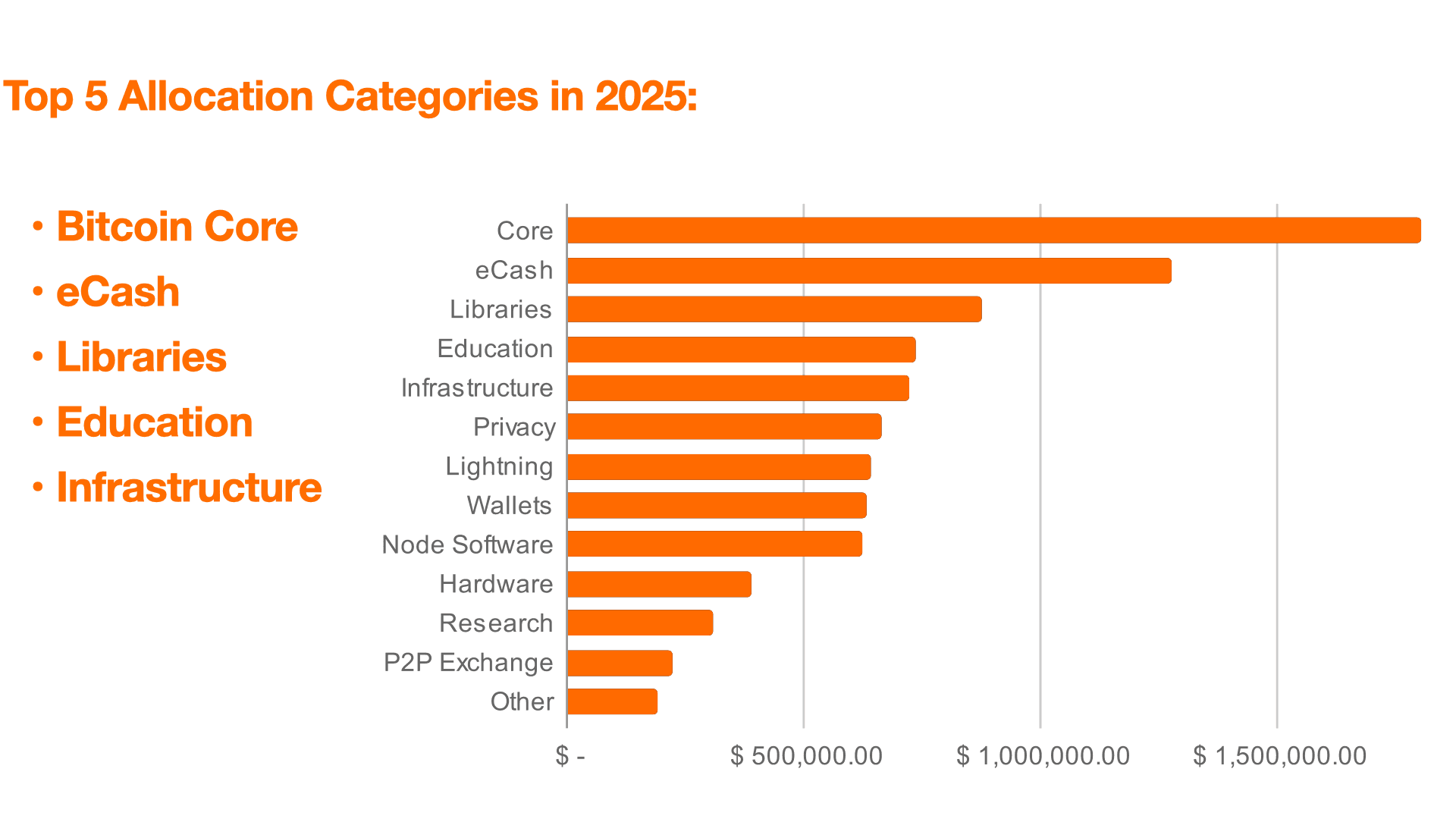 Since we don't take a cut from donations designated for open-source development, we are incredibly grateful to have received additional operational budget from the Human Rights Foundation, as announced in February 2025 (and again in January 2026). Our operational budget is what allows us to keep the lights on, covering operations and contractor expenses, legal and compliance fees, software and services, as well as exchange and transaction fees. The financial statements on our transparency page go into more detail in regards to our operational expenses. Our operational expense in 2025 was roughly 6% of the total expense of our grant programs.